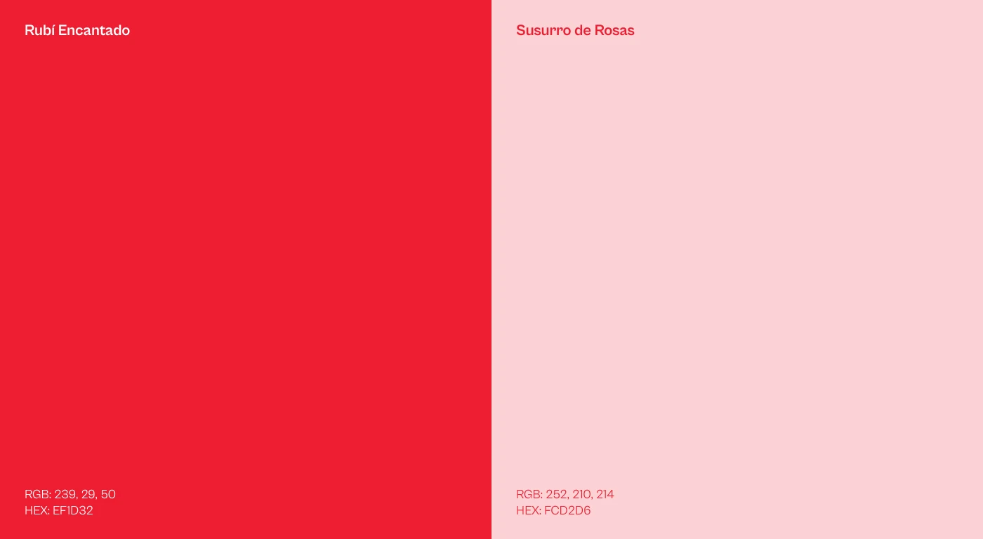 La paleta cromática está compuesta por dos tonos de rojo. La combinación de estos colores crea una estética femenina, moderna y sofisticada, asegurando que cada aplicación de la marca refleje su exclusividad y autenticidad.